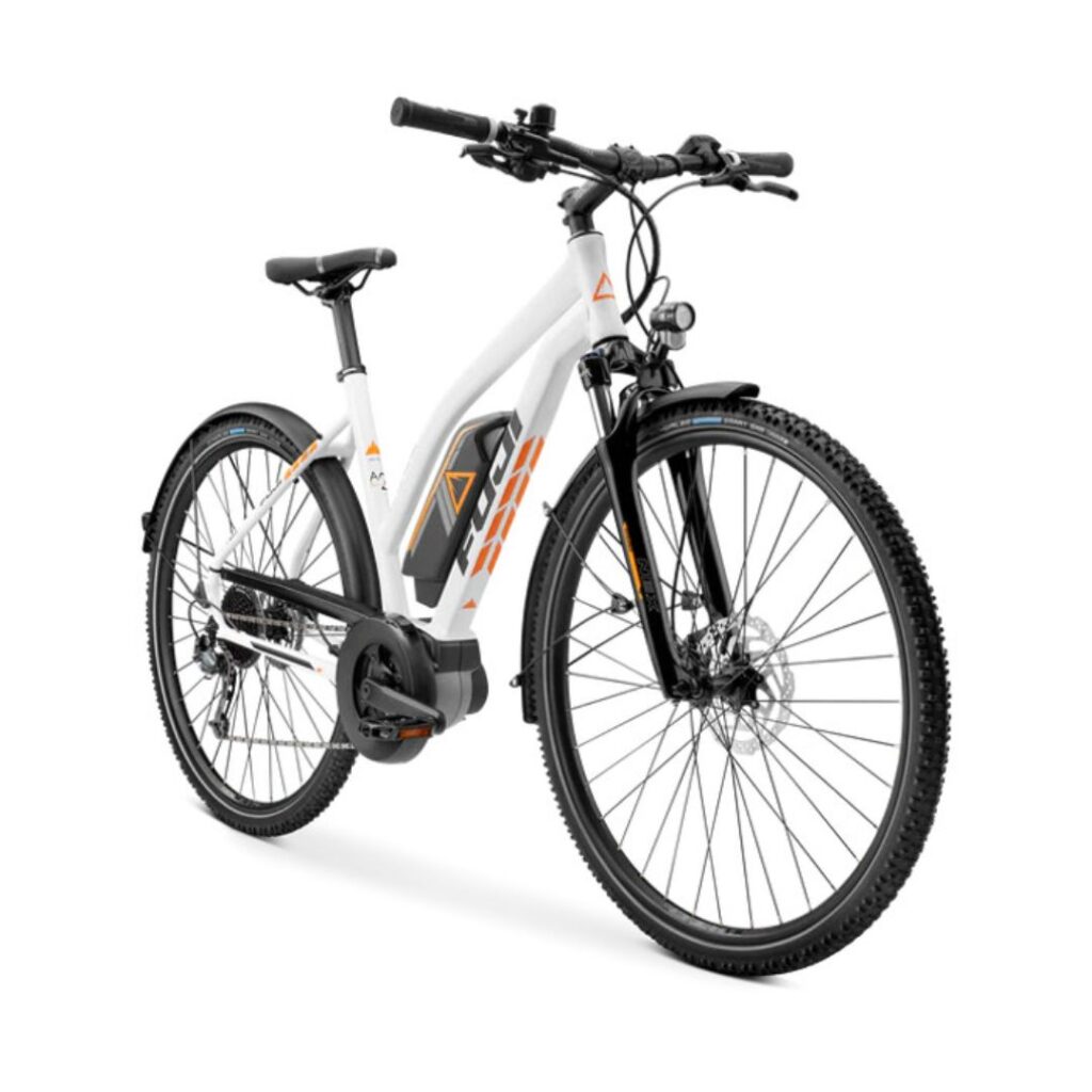 Our e-bike fleet includes the Fuji E-Traverse 1.1+ ST (trapeze frame) and the Giant Entour E+ 2 (step-through).
