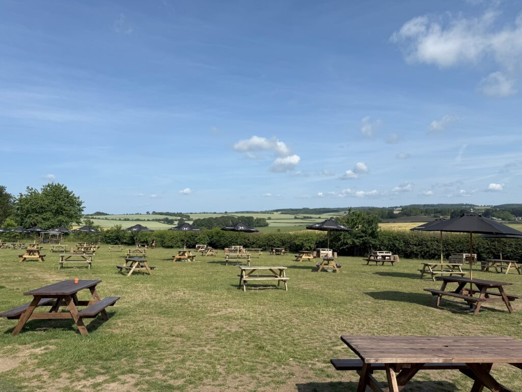 From there, it’s a short walk to the entrance. The view from the pub garden is classic Cotswolds, rolling hills and peaceful pastures as far as the eye can see.
